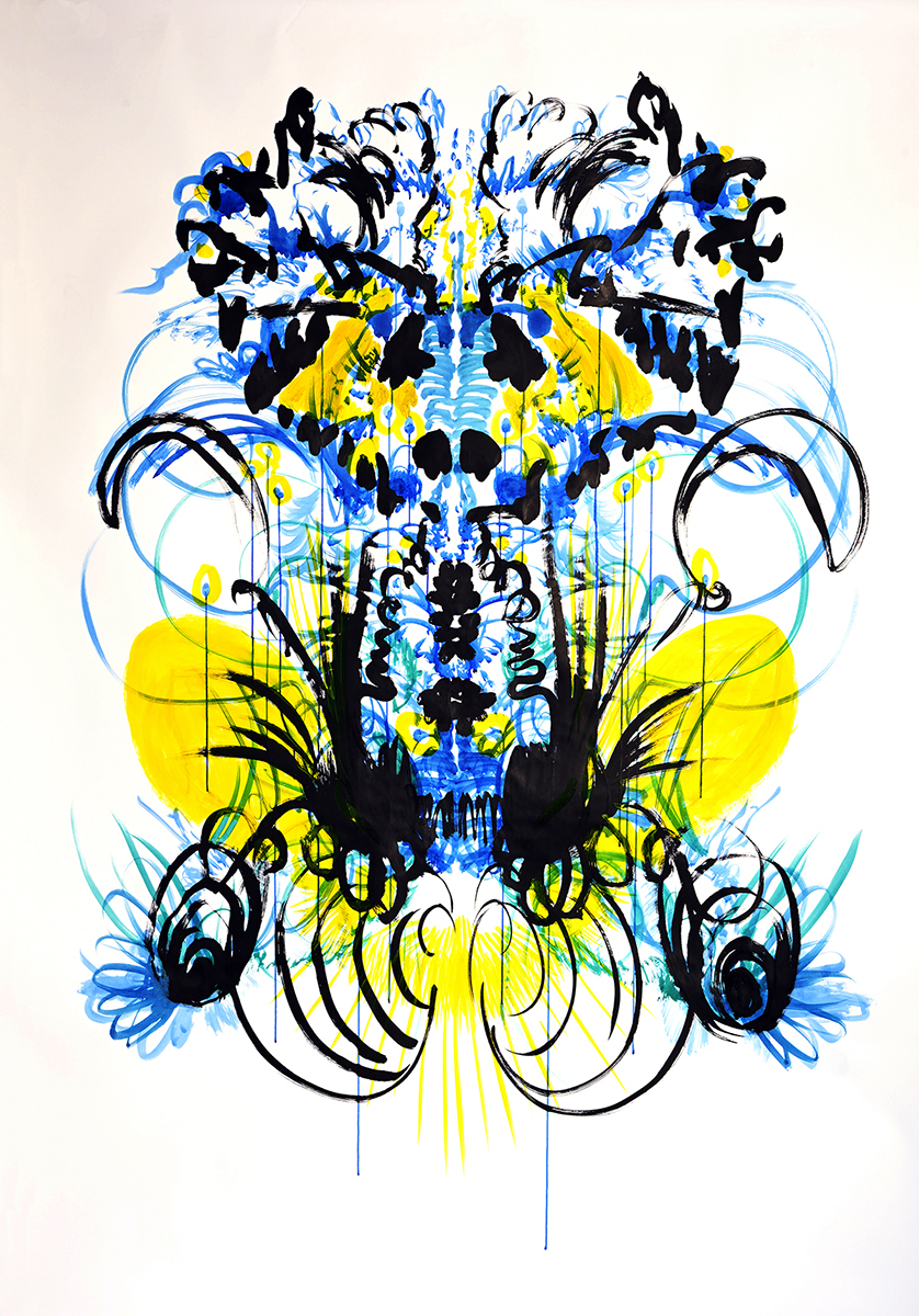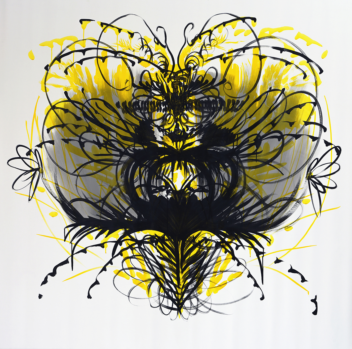 Fermer les yeux pour voir, encre de chine et de couleur sur toile, 160 cm x 160 cm / 2025Ayurnamat, encre de chine et de couleur sur papier, 150 cm x 180 cm / 2025Infernales cigales, encre de chine et de couleur sur papier, 150 cm x 60 cm / 2025